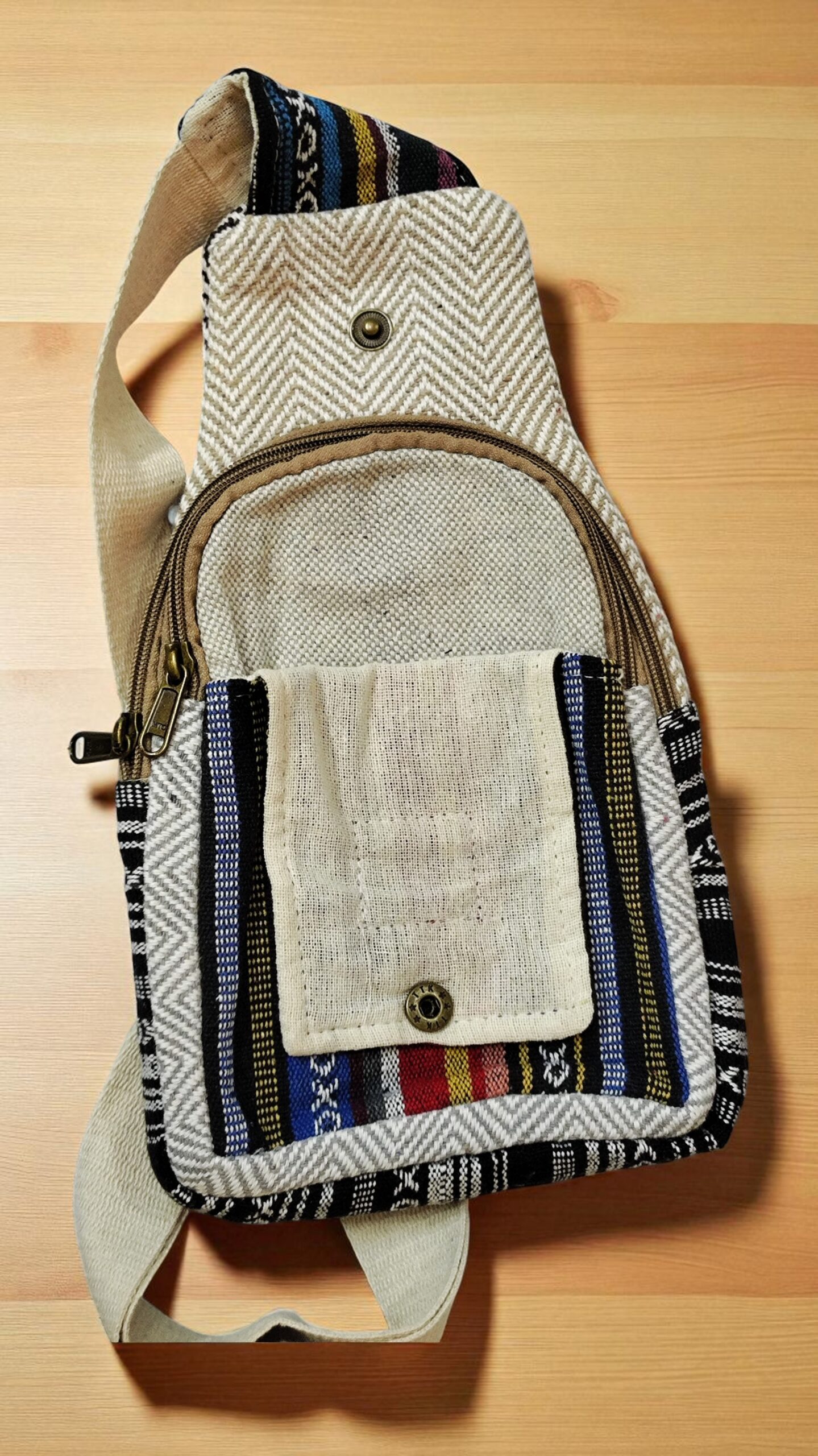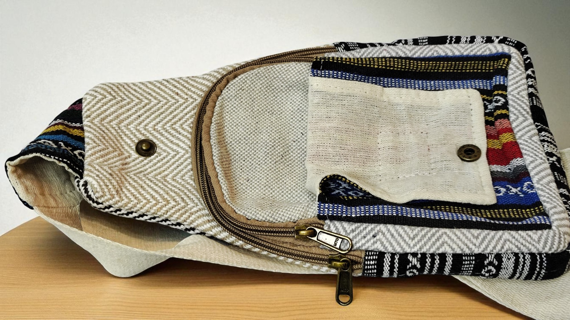 - Material: The label indicates “NATURAL HEMP” and “100% COTTON.” The bag is made from a variety of woven fabrics.