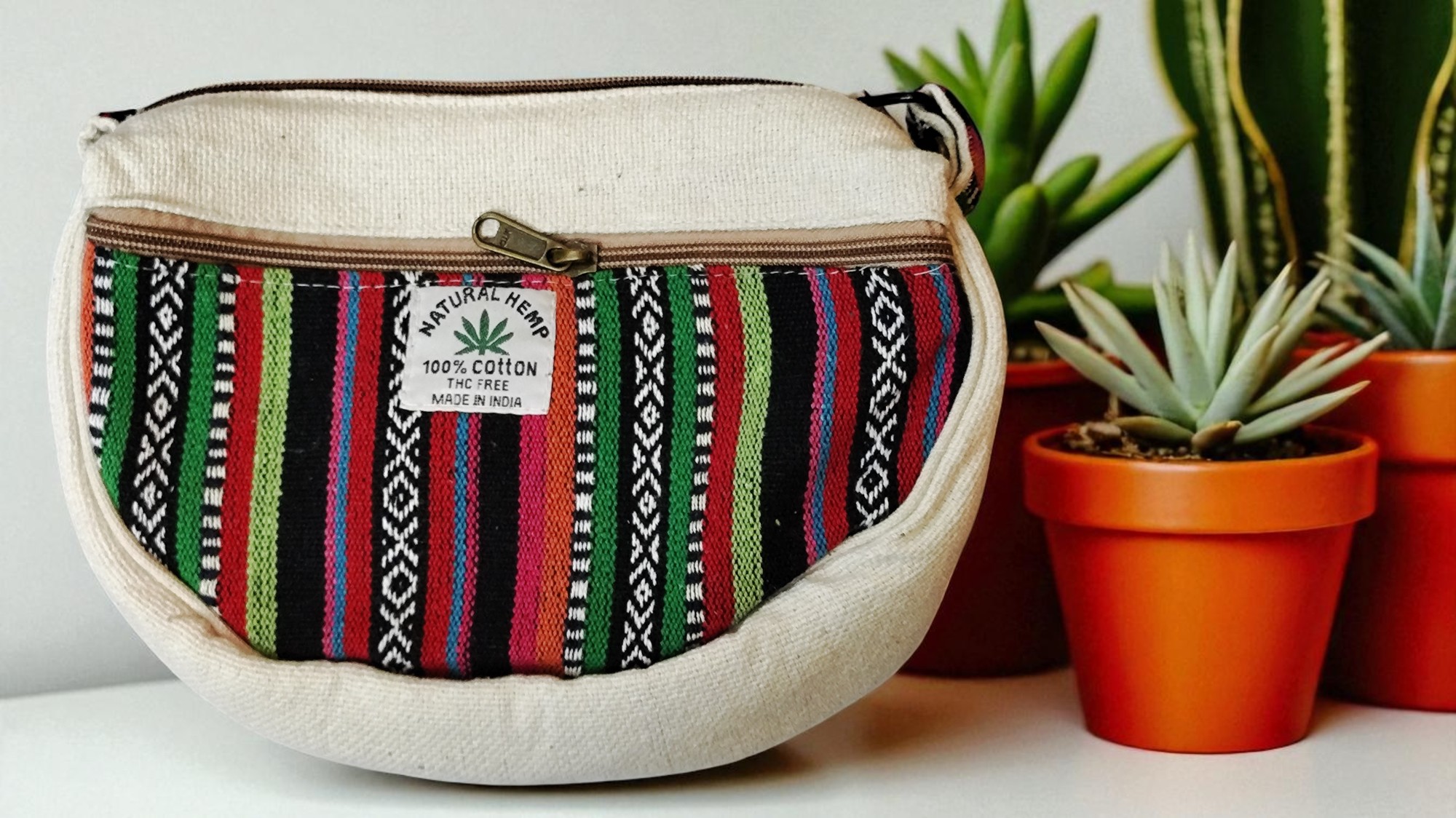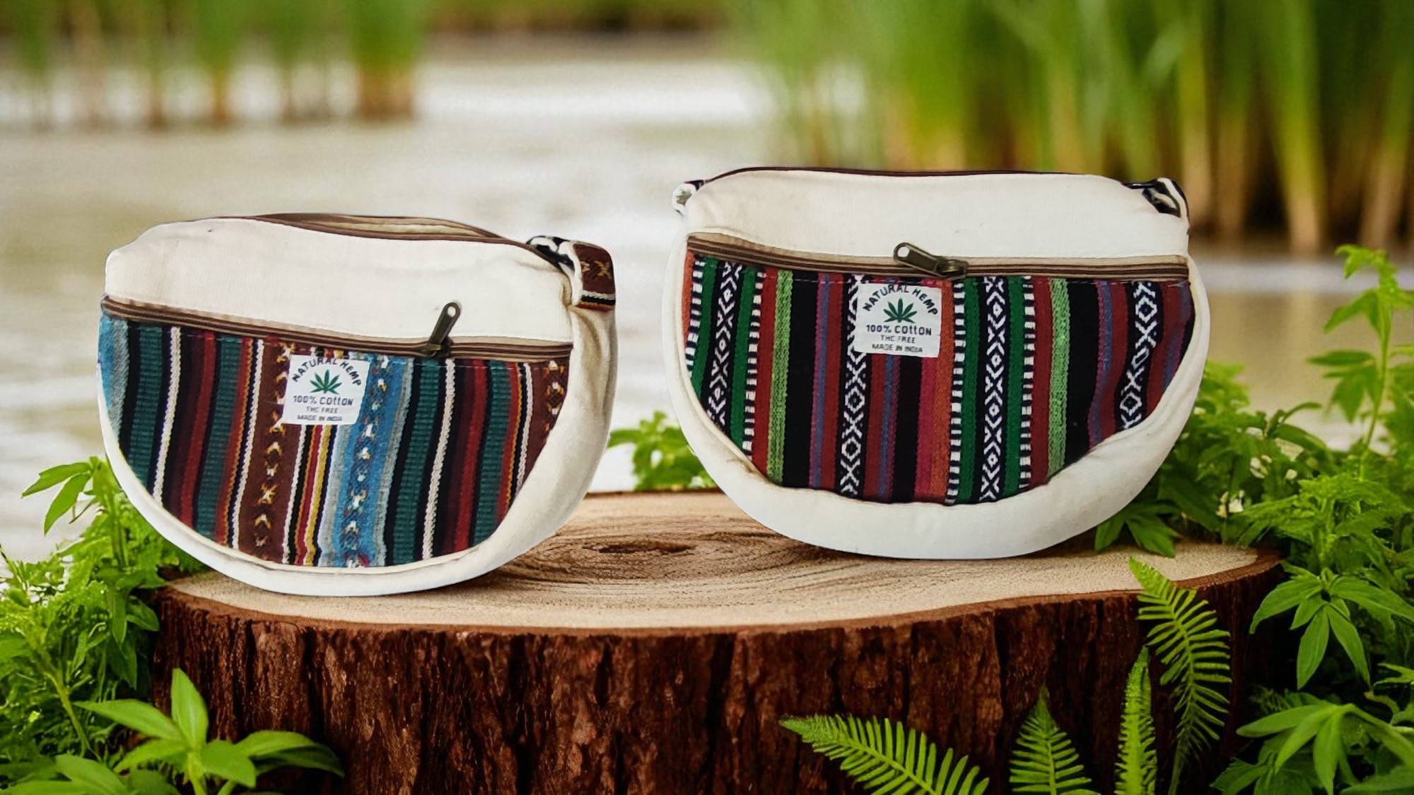 - Additional Features: A small, sewn-on label is visible on the front of each bag, reading “NATURAL HEMP,” “100% COTTON,” “THC FREE,” and “MADE IN INDIA.”
