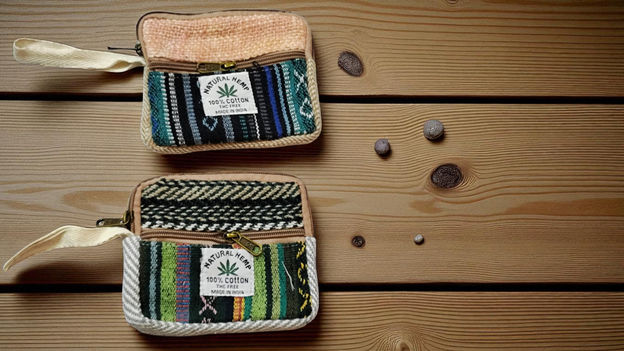 - Main Body: Both pouches have a distinct woven pattern, with a solid-colored top and a patterned lower half.